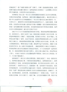 這時就留下一個公安人員來安慰我說:我都已經說了,你是一個很好的人,我們現在還是說正事,只要你好好跟我們配合,我們就把你放了。我問他怎麼配合?他說:這些就是你的審訊筆錄,你只要在這些材料上簽字,就沒你的事了,你就可以出去了。我拿過來一看,這些根本不是我說的,我更沒有做過這些,完全是他們自己編出來的一些東西,他們寫的假的記錄上說那些“犯罪”都是我的師父南無第三世多杰羌佛指使我做的。我嚇呆了,我說:這些都是假的、沒有的事,我怎麼能配合?!那個公安說:“沒有?那是過去沒有嘛,你今天簽字了,就有了嘛。古代沒有飛機原子彈,現在不是有了嗎?你只要簽字就行了。”這是憑空捏造,我和師父根本沒有做這些事啊!所以我就不簽,不答應配合他們。他們於是開始刑訊逼供,用各種酷刑,軟硬兼施來迫害我,但是無濟於事,我始終不與他們合作,結果被迫害坐了四年半的牢(我十年前寫的兩份有關材料也附在後面)。